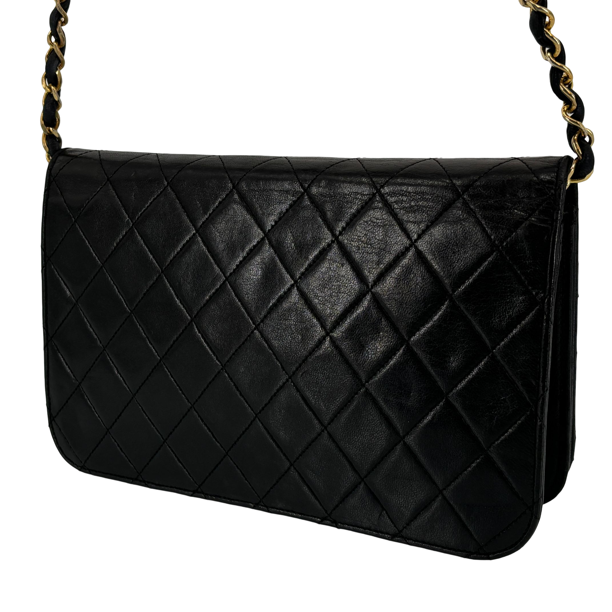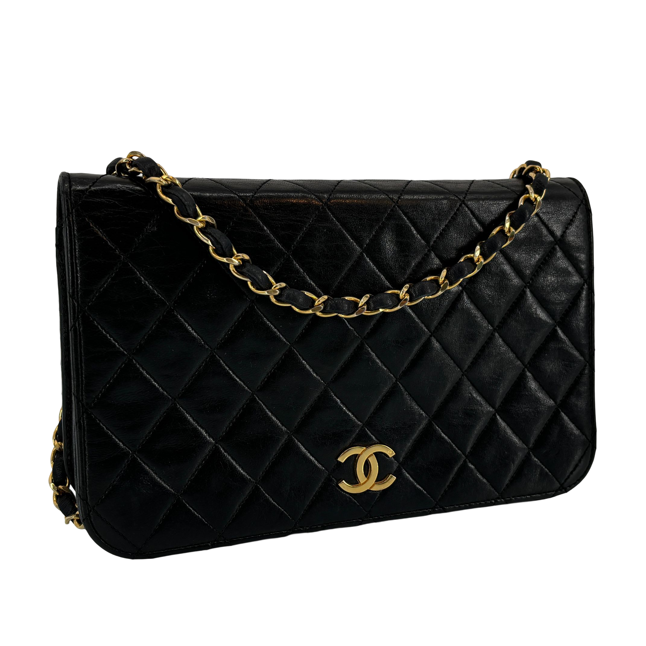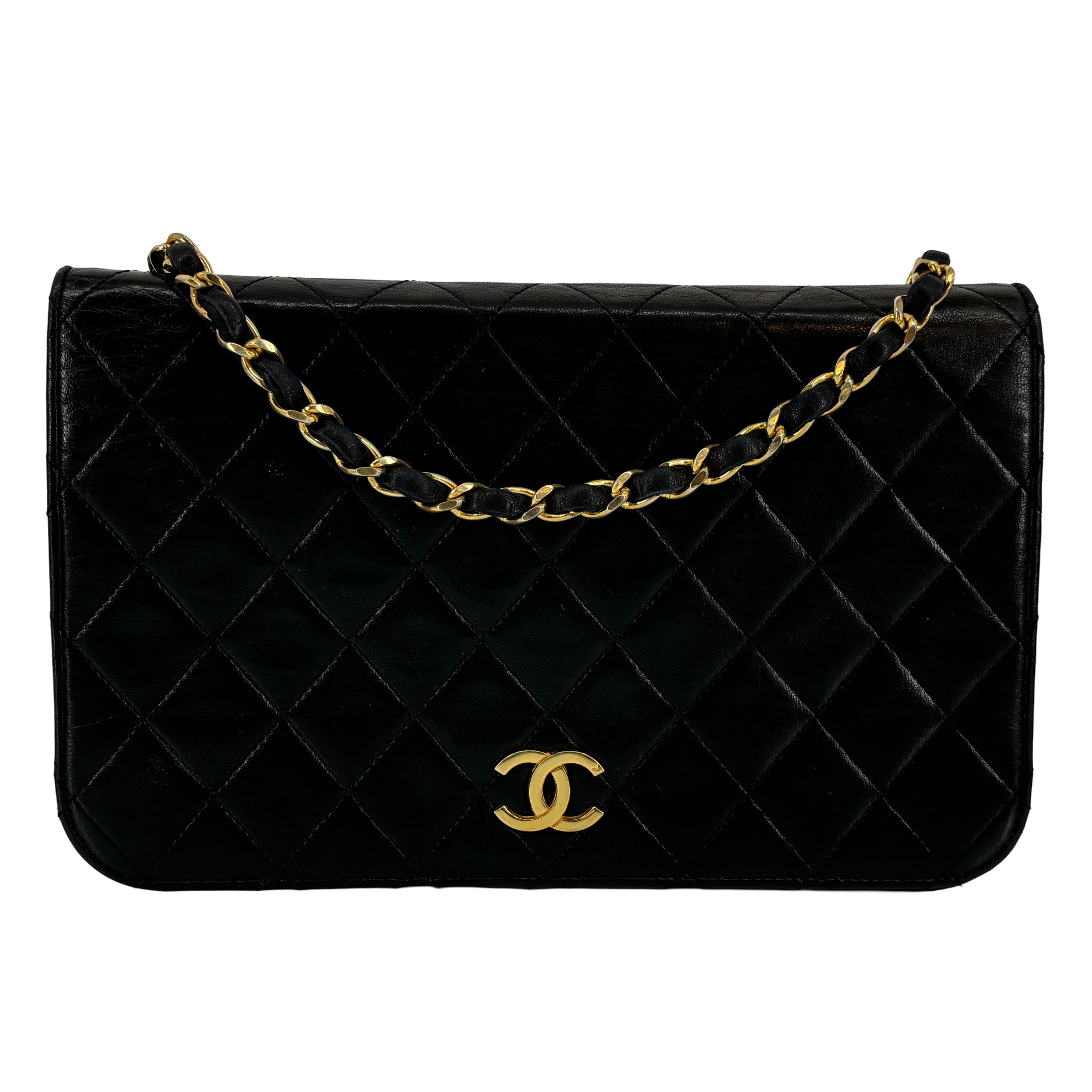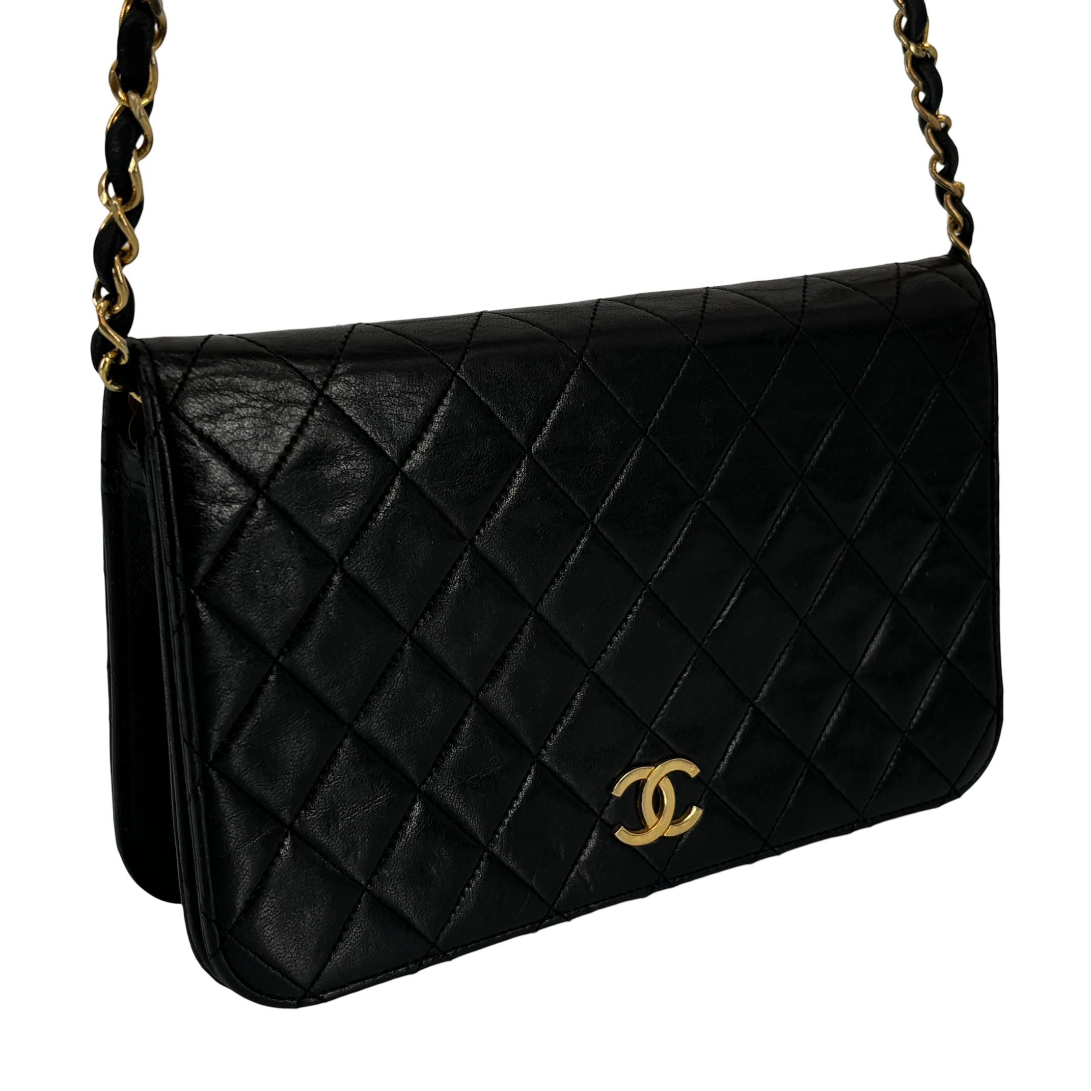 - Chanel Full Flap Bag Push-Lock Black Matelassé Leather