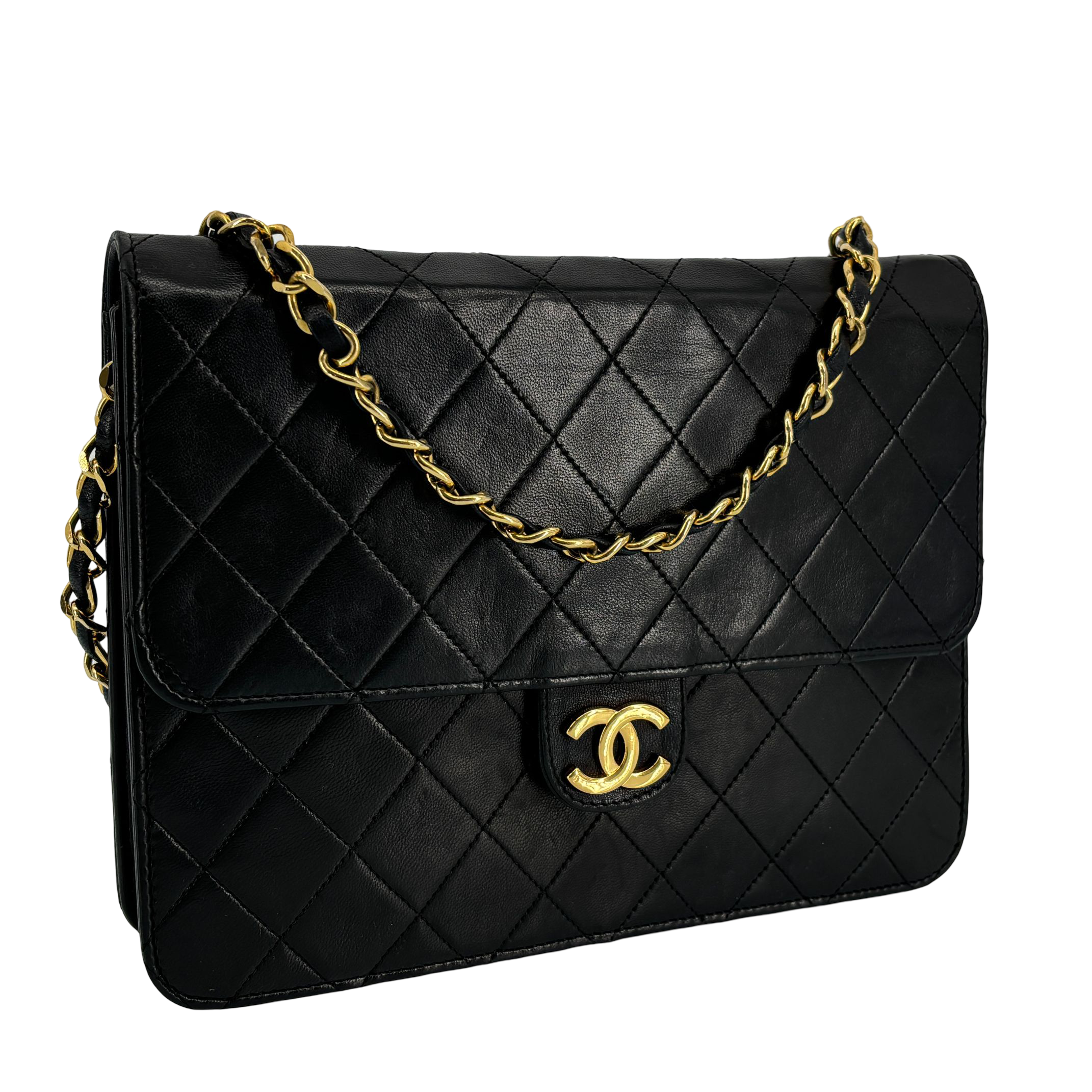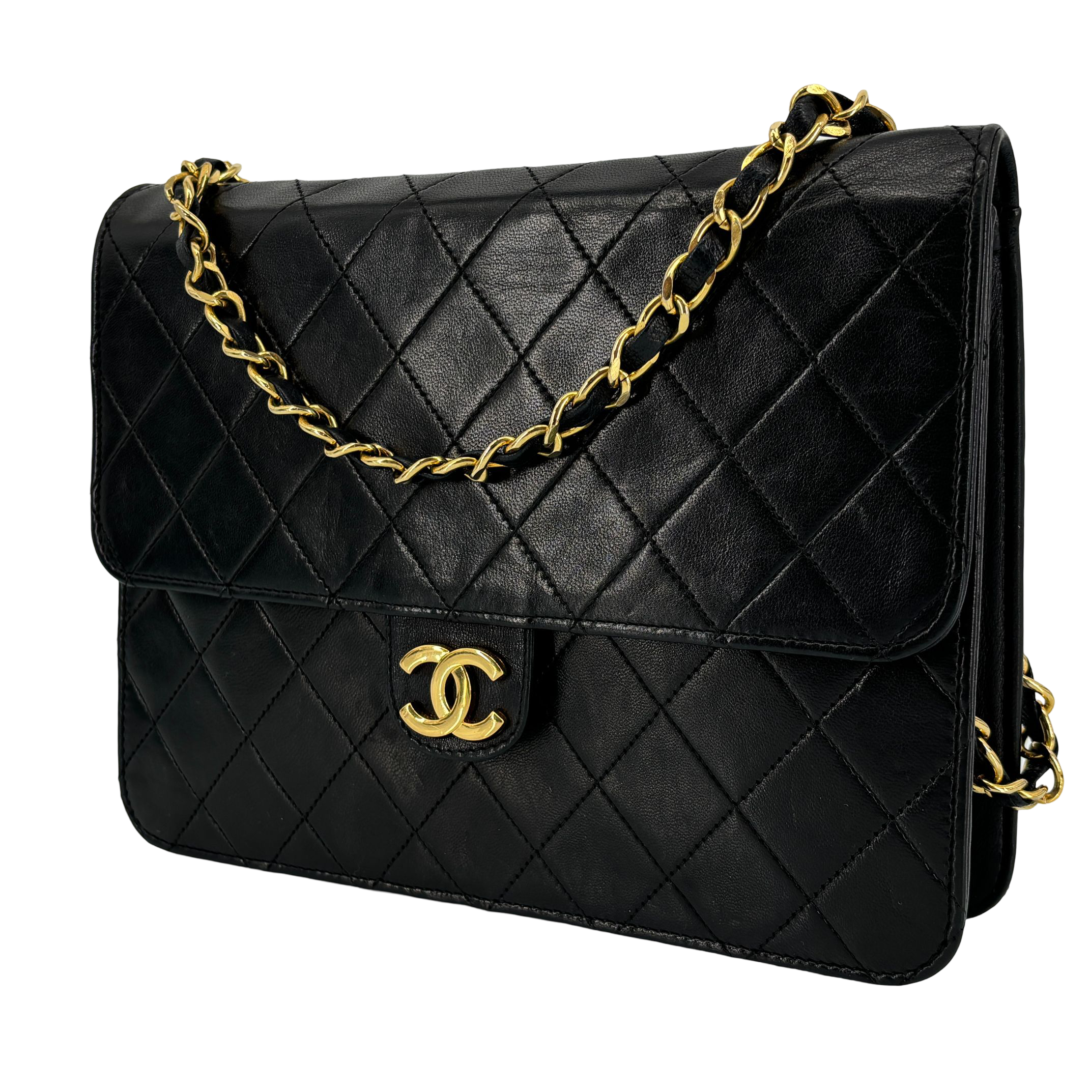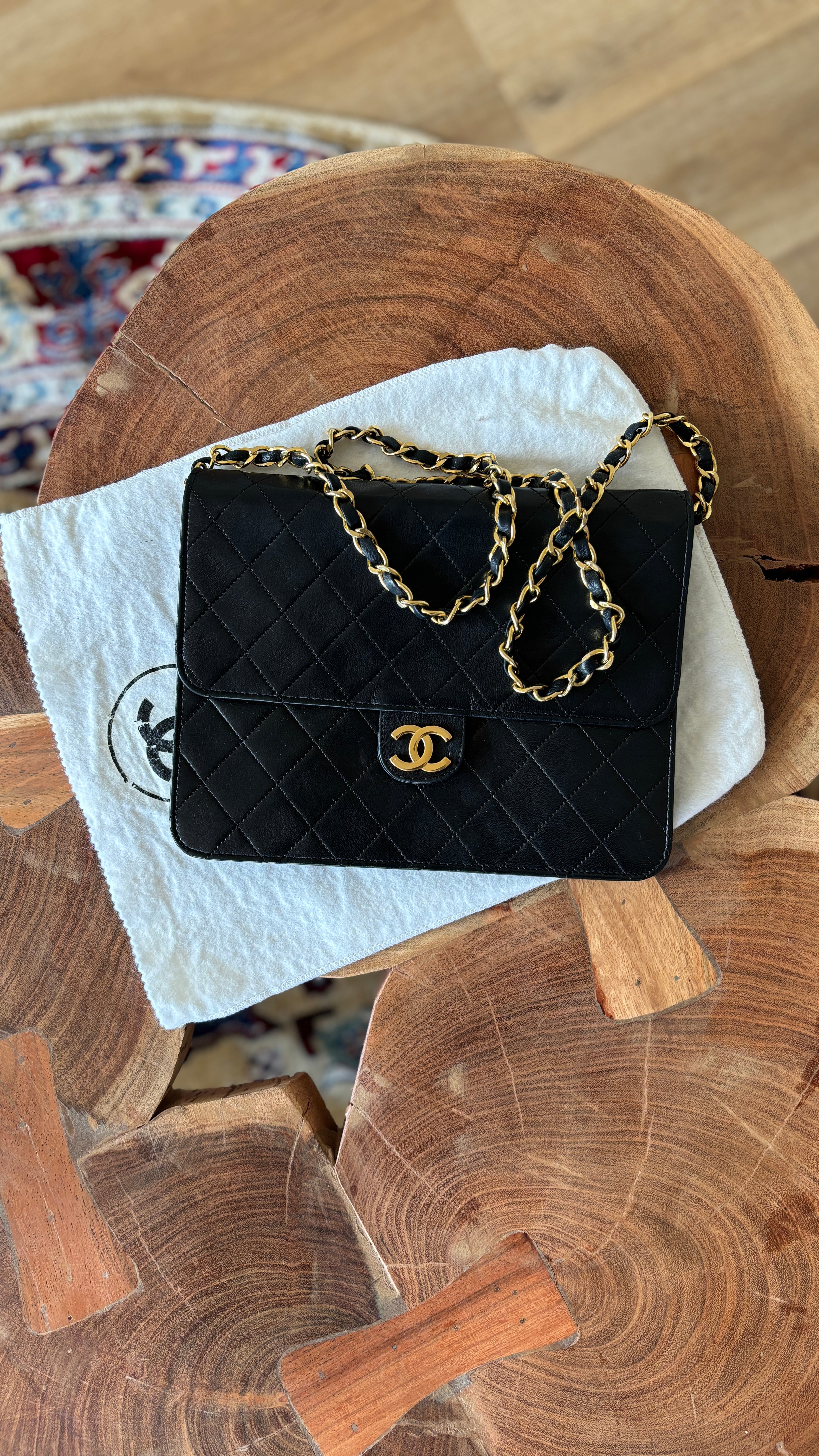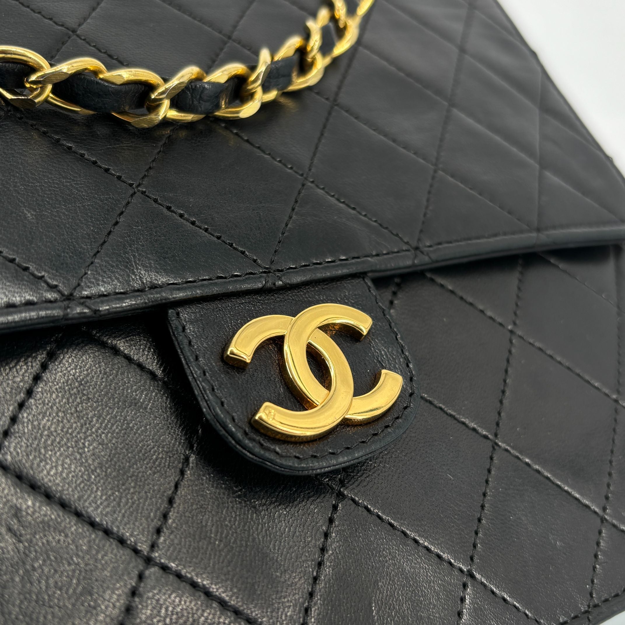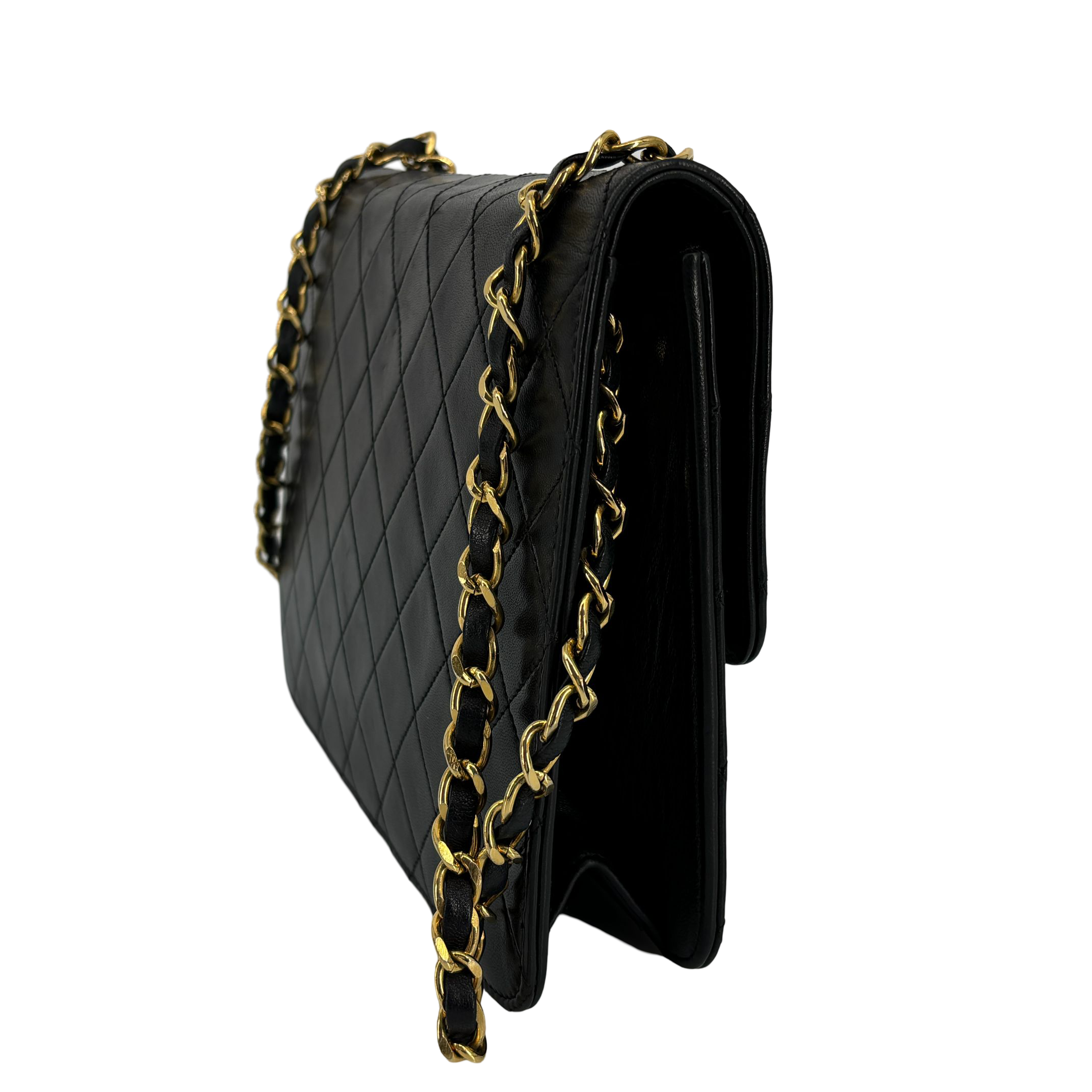 - Chanel Single Flap Bag Push-Lock Black Matelassé Leather