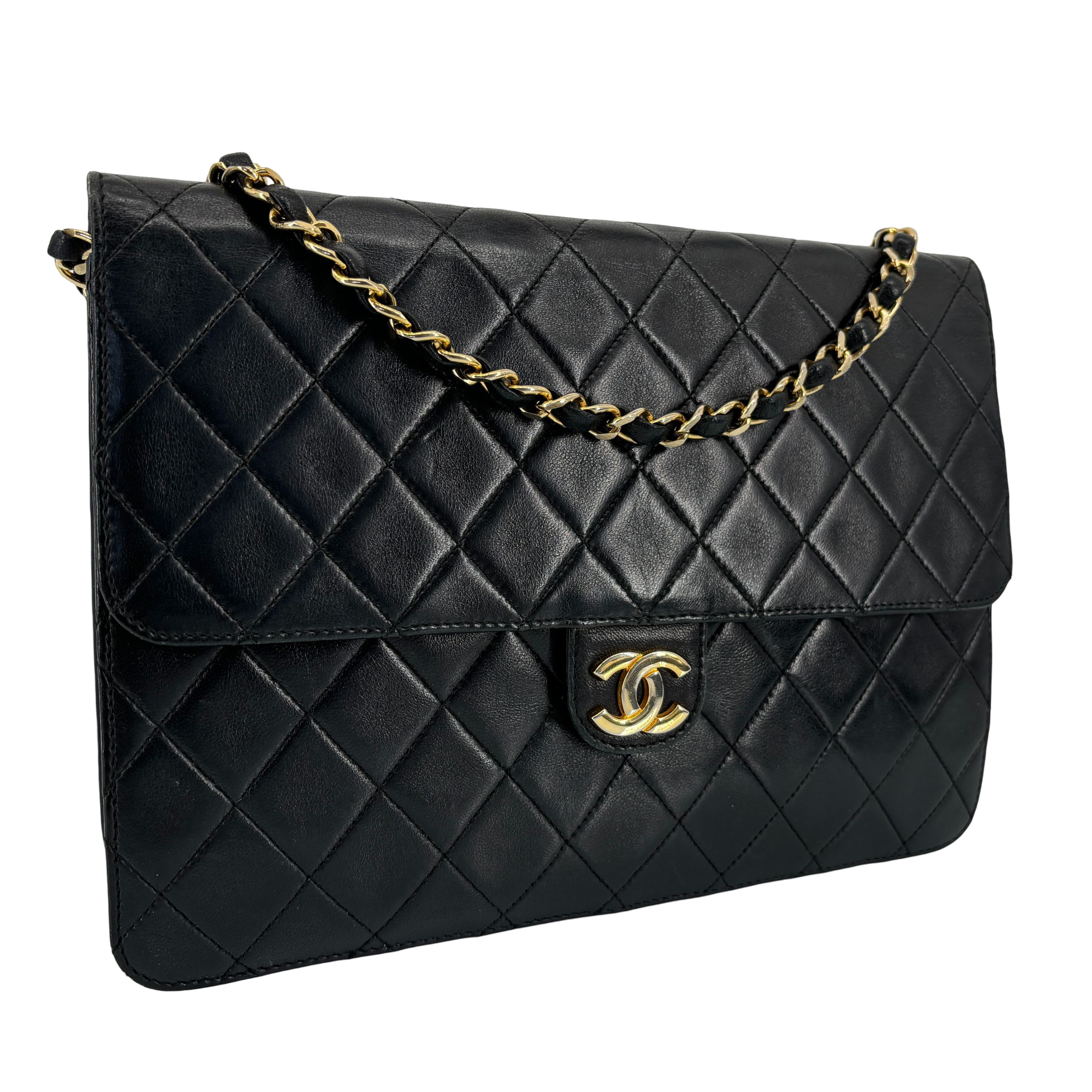 - Chanel Single Flap Bag Push-Lock Black Matelassé Leather