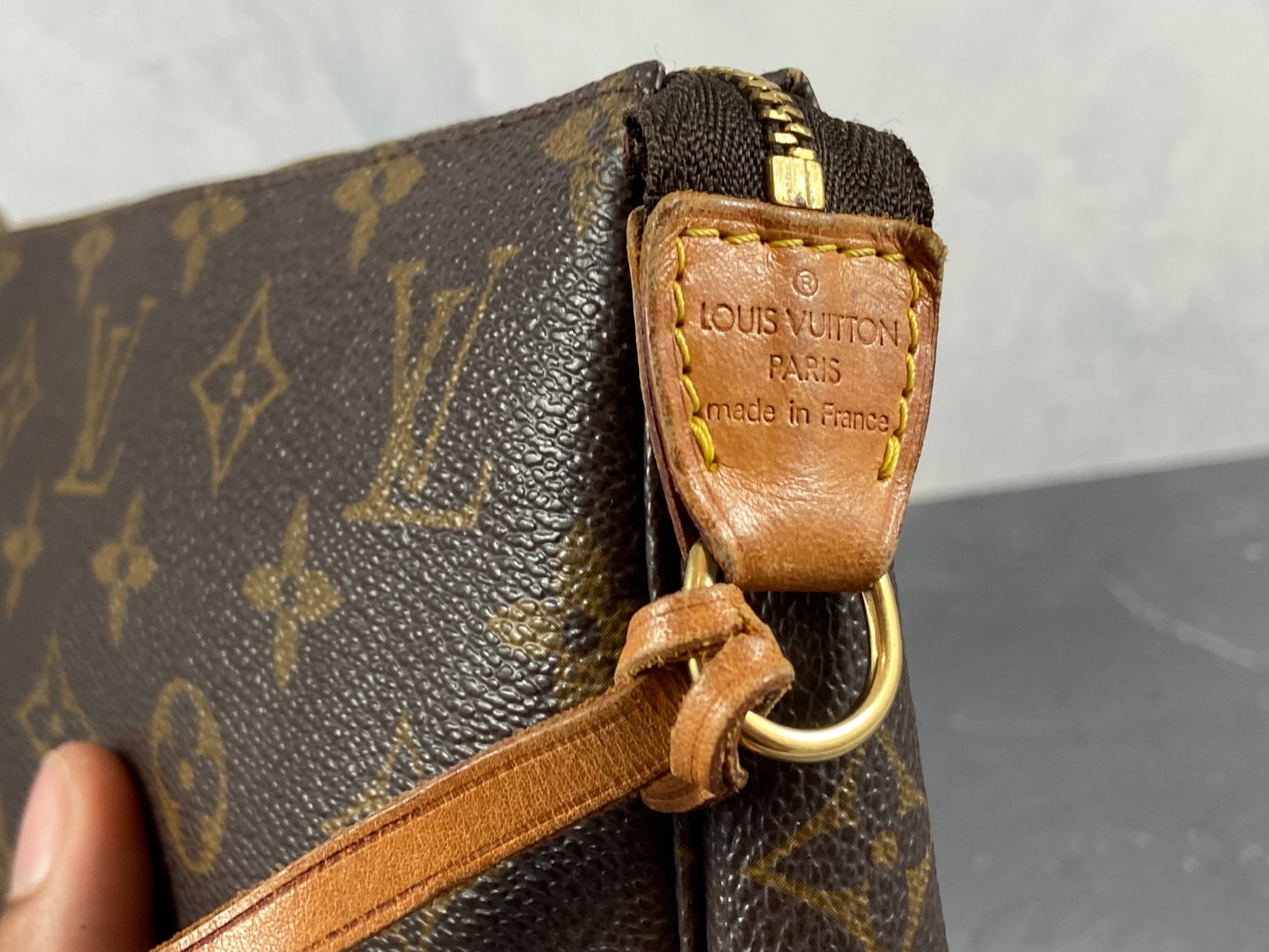 - condition as pictured (pochette is in pretty nice condition for its age, strap is very used and zipper pull missing but the pochette is still good usable)